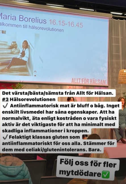 Maria Borelius intervjuas och vi blir varse att vi ska äta mat som är så kallat antiinflammatorisk. Det finns dock inga enskilda livsmedel som dämpar inflammationer i kroppen. Och att gluten skulle vara inflammatoriskt är endast sant för en grupp, de med celiaki. Andra tål gluten. Punkt. Enligt läroboken på olika medicinska utbildningar lär man sig att att man får låg halt av skadliga inflammatoriska processer i kroppen när man har normalvikt och använder sin muskelmassa, det vill säga är rörlig. Och äter bra överlag.