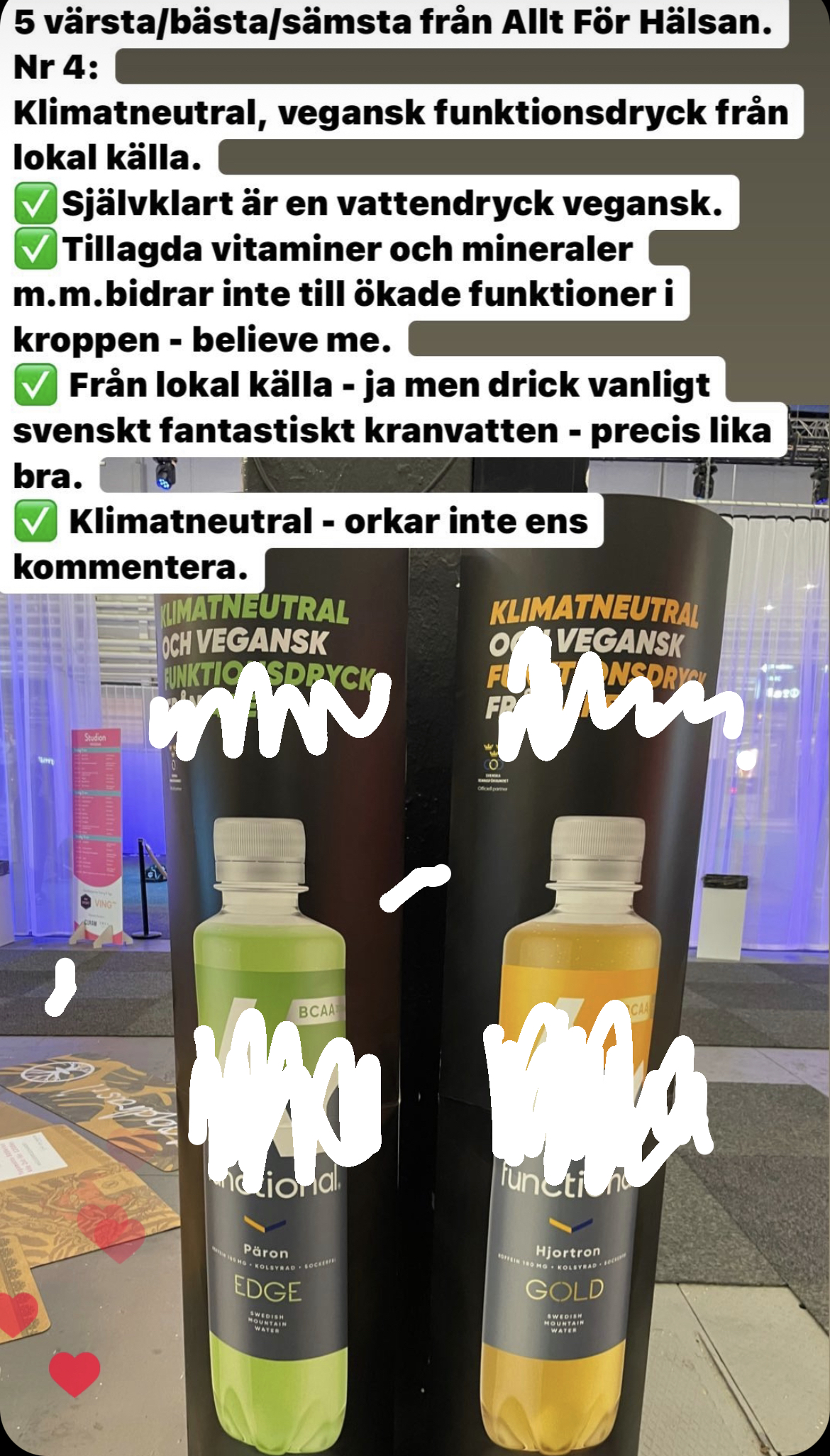 Går därefter nästan rakt in i två stora roll-ups som marknadsför klimatneutral, vegansk funktionsdryck från lokal källa. Men, en vattendryck är ju naturligt vegansk. Att tillsätta diverse vitaminer, mineraler och koffein ger inga särskilda funktioner. De hade dessutom även med D-vitamin som är ett fettlösligt vitamin, det finns bara i mat som innehåller fett. Alltså omöjligt i en vattendryck. Drick ett glas kranvatten där du är just nu och ta en frukt och kanske en kopp kaffe så är du hemma.