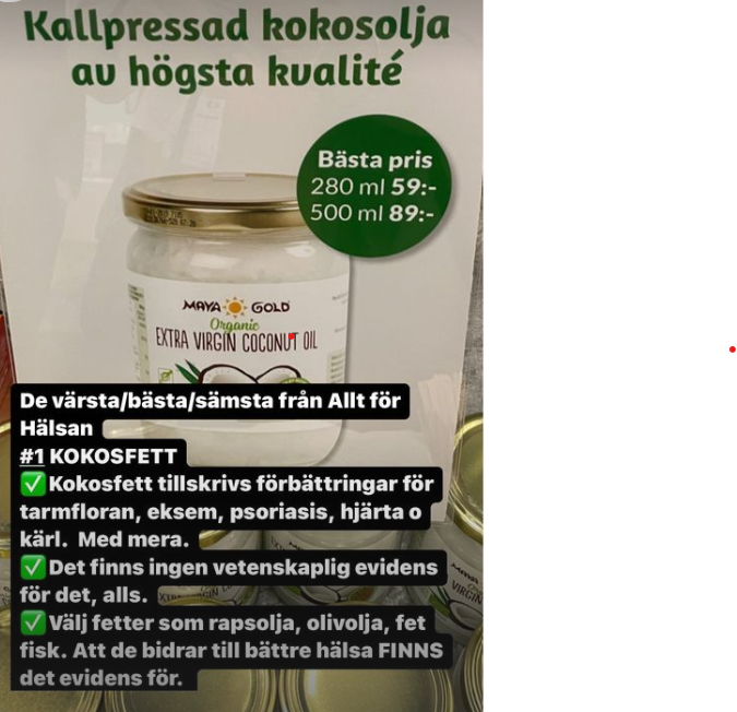 Kokosfettet säljs som ett undermedel och är enligt de faktablad som cirkulerar lösningen för herpes, influensa, mässling, stafylokocker, bättre tarmflora, minskar eksem, akne, psoriasis, skyddar levern och förhindrar fotsvamp. Det är i själva verket inte sant. Kokosfett innehåller fett som på intet sätt är bra för hälsan. Jag frågar om underlag för deras påståenden och får en personlig berättelse om egna bra blodvärden till svar. Oprofessionellt.